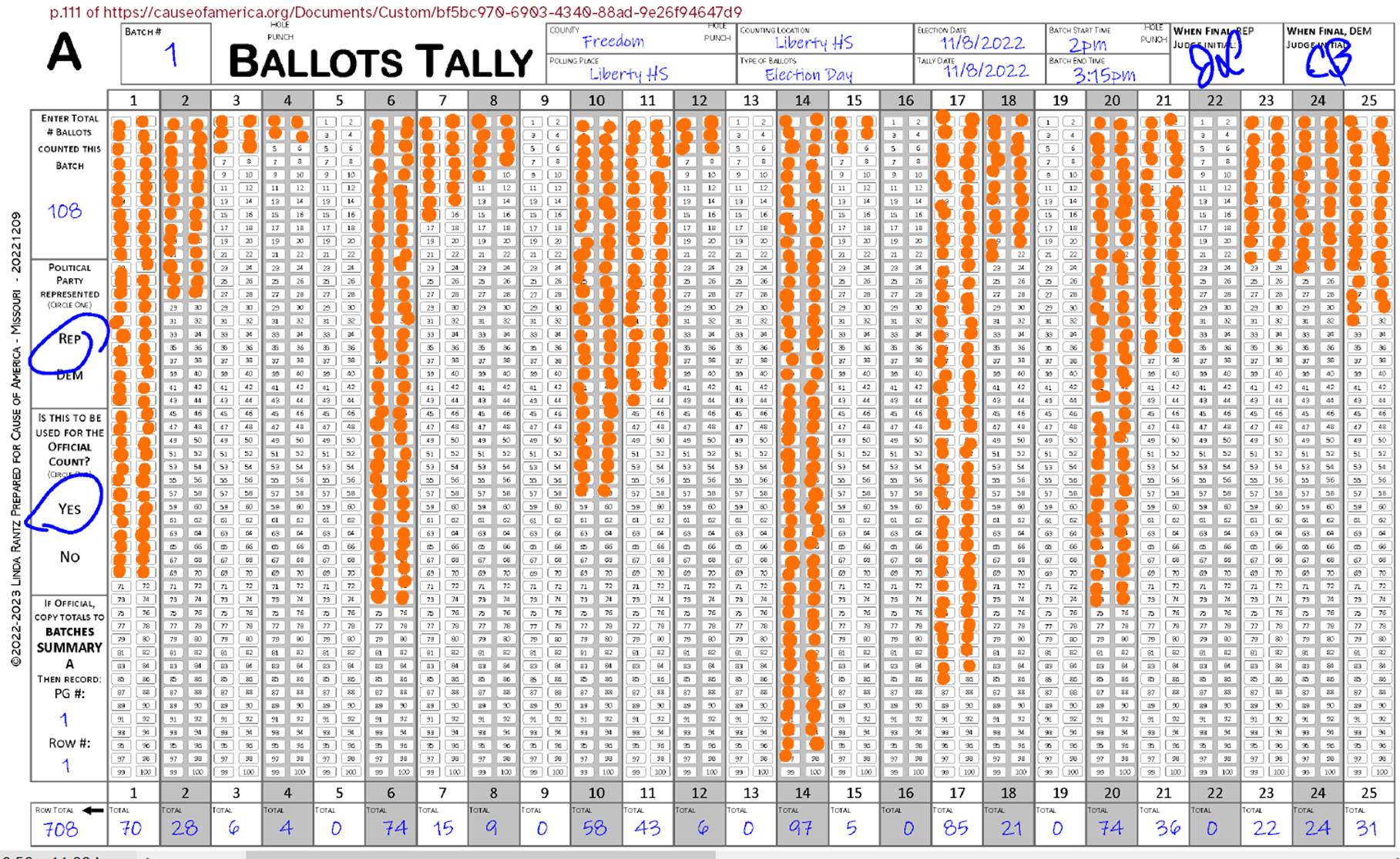 “Cause of America” prefers candidates be numbered on the ballots, so reader can call out the number for talliers to enter on sheet. New sheet for each 25 candidates. Video. Manual covers how these would be copied to summary sheet and added with a calculator.