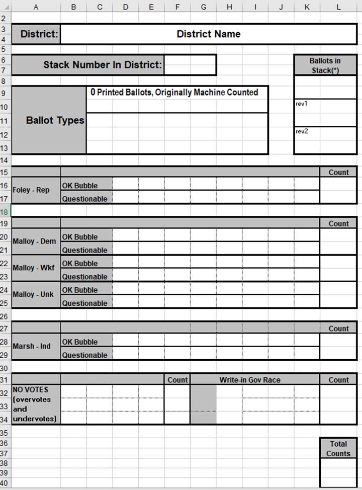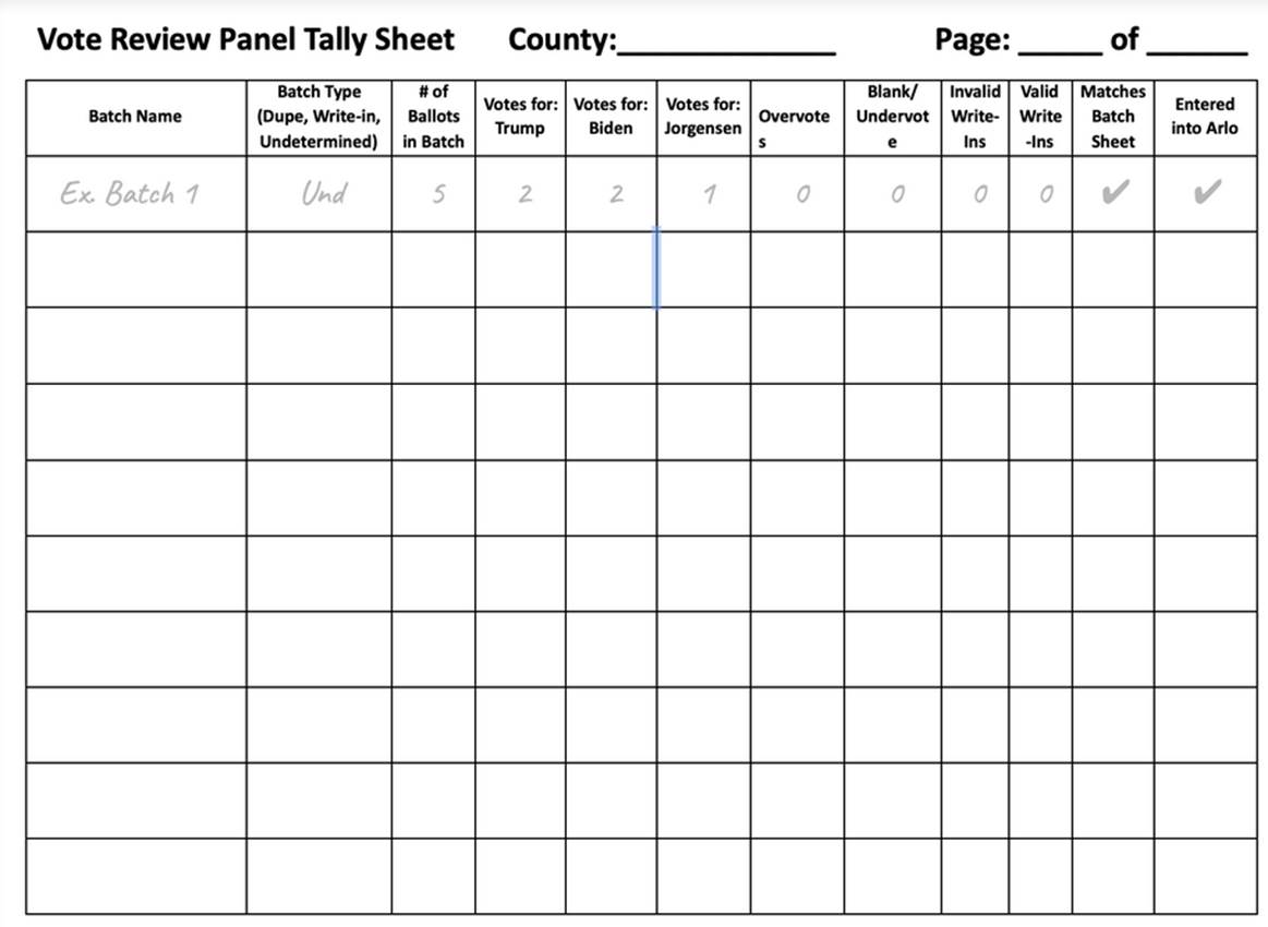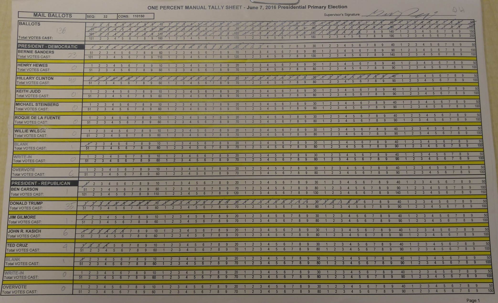 1% audit by county. Includes write-in total & over & undervotes. Instructions and sheet available.