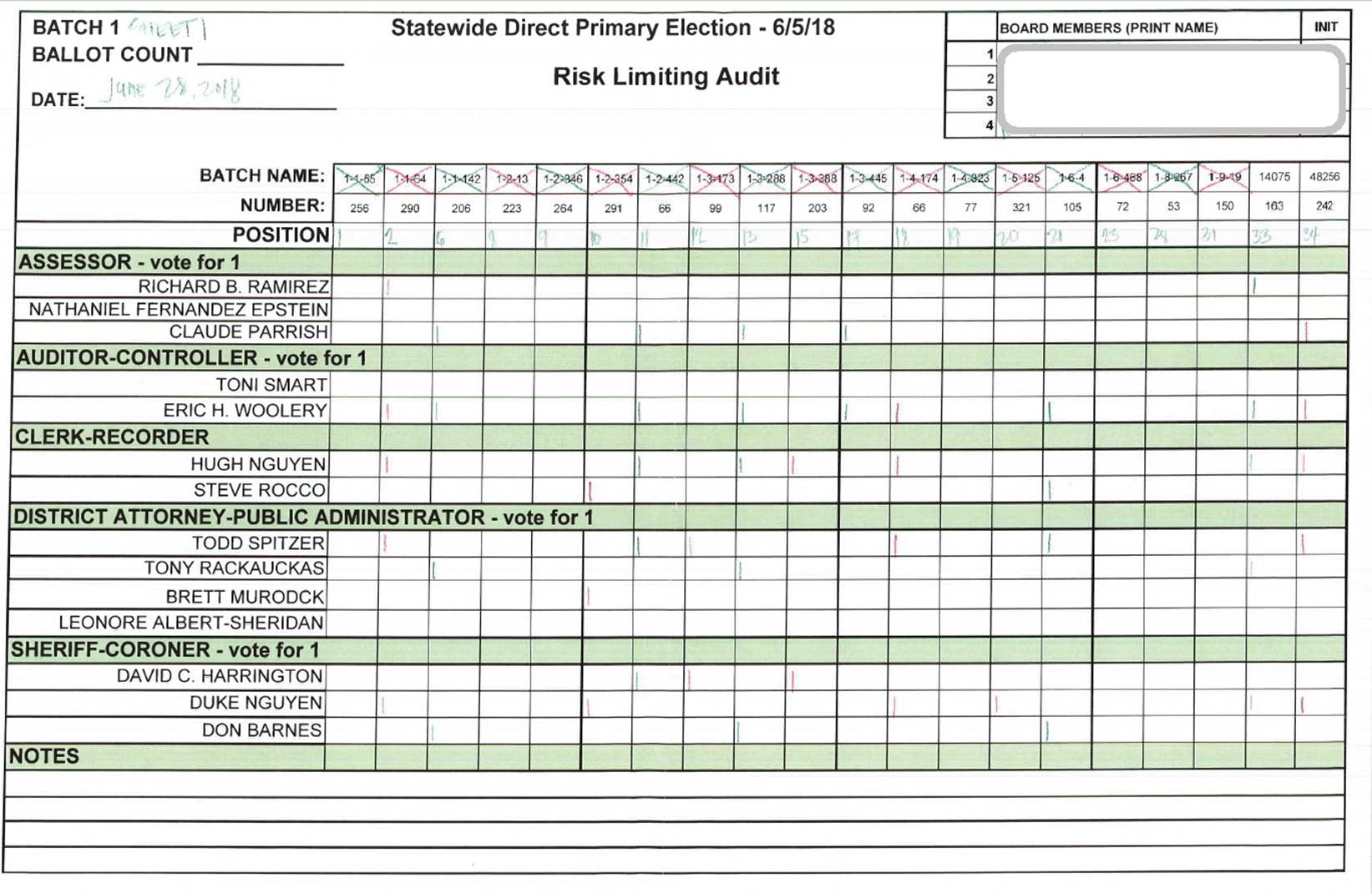 This was a ballot polling risk-limiting audit (RLA) of 5 primary contests with wide margins. They did not tally write-ins, overvotes or undervotes. Report is at https://verifiedvoting.org/publication/orange-county-ca-pilot-risk-limiting-audit/